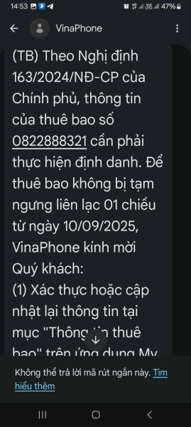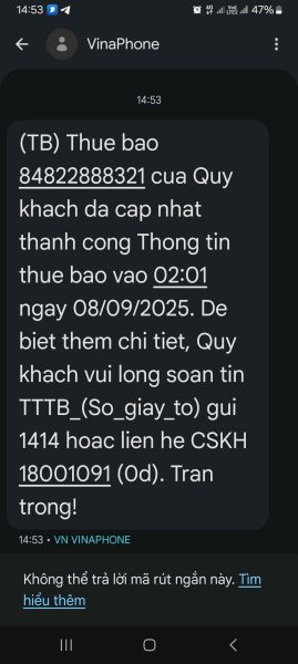 Khi thuê bao nhận được tin nhắn sau, quý khách vui lòng cập nhật thông tin, sang tên chính chủ để dùng lâu dài